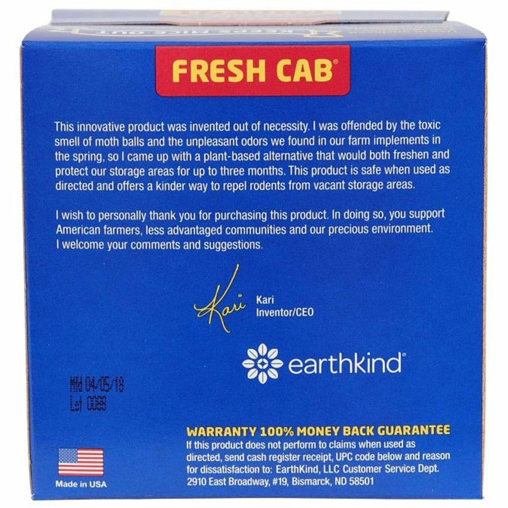 The only botanical repellent found to be effective and safe by the Federal EPA, Fresh Cab® Rodent Repellent keeps mice out of homes, cabins, basements, attics, garages, sheds and storage units with a pleasant “woodsy” scent they find offensive. Protect stored vehicles, boats, RVs, ATVs, campers, snowmobiles and farm equipment. Fresh Cab also repels mice from pet food, birdseed and livestock feed. It is safe, effective and easy to use. The only botanical rodent repellent effective enough to be registered by the Federal EPA and trusted by licensed pest control experts for both effectiveness and safety. Grown on family farms and made of essential oils and plant fiber ingredients. Designed by inventive artists, scientists, and engineers who care about the earth. Made in the USA.