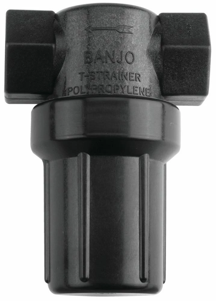 Polypropylene T strainer with Clear nylon bowl, 1/2″ female NPT threads with 50 Mesh Screen