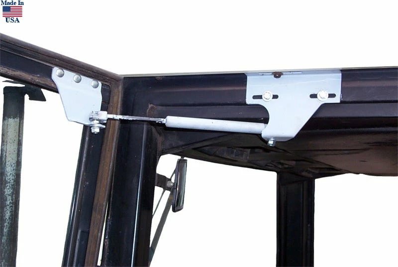 Door Cylinder Kit mounts on the left or right side door and door frame to allow tractor cab door to open wider for improved access into cab. Color is black (shown in white for clarity only).