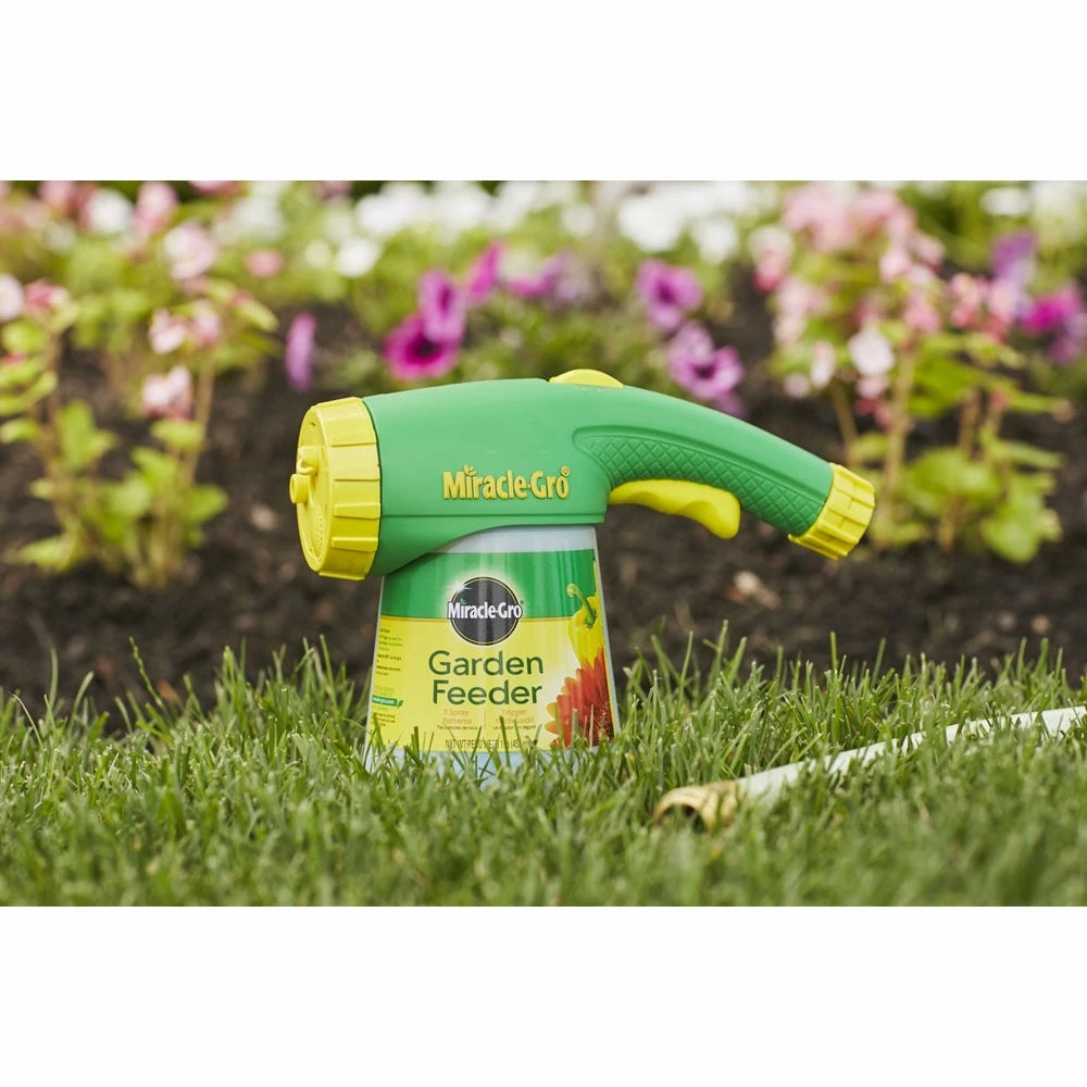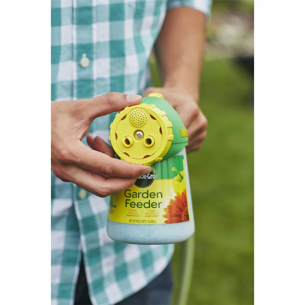 Take care of outdoor plants like flowers, vegetables, trees and shrubs with the Miracle-Gro Garden Feeder. Built with trigger lock technology for one-handed feedings, the Garden Feeder features 3 spray patterns for every job. Plus, it includes 1 lb. of Miracle-Gro Water Soluble All Purpose Plant Food. Feed plants every 2 weeks for best results.