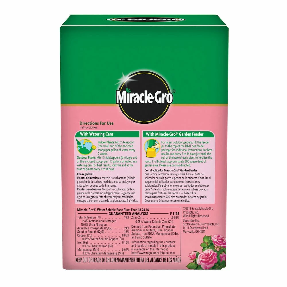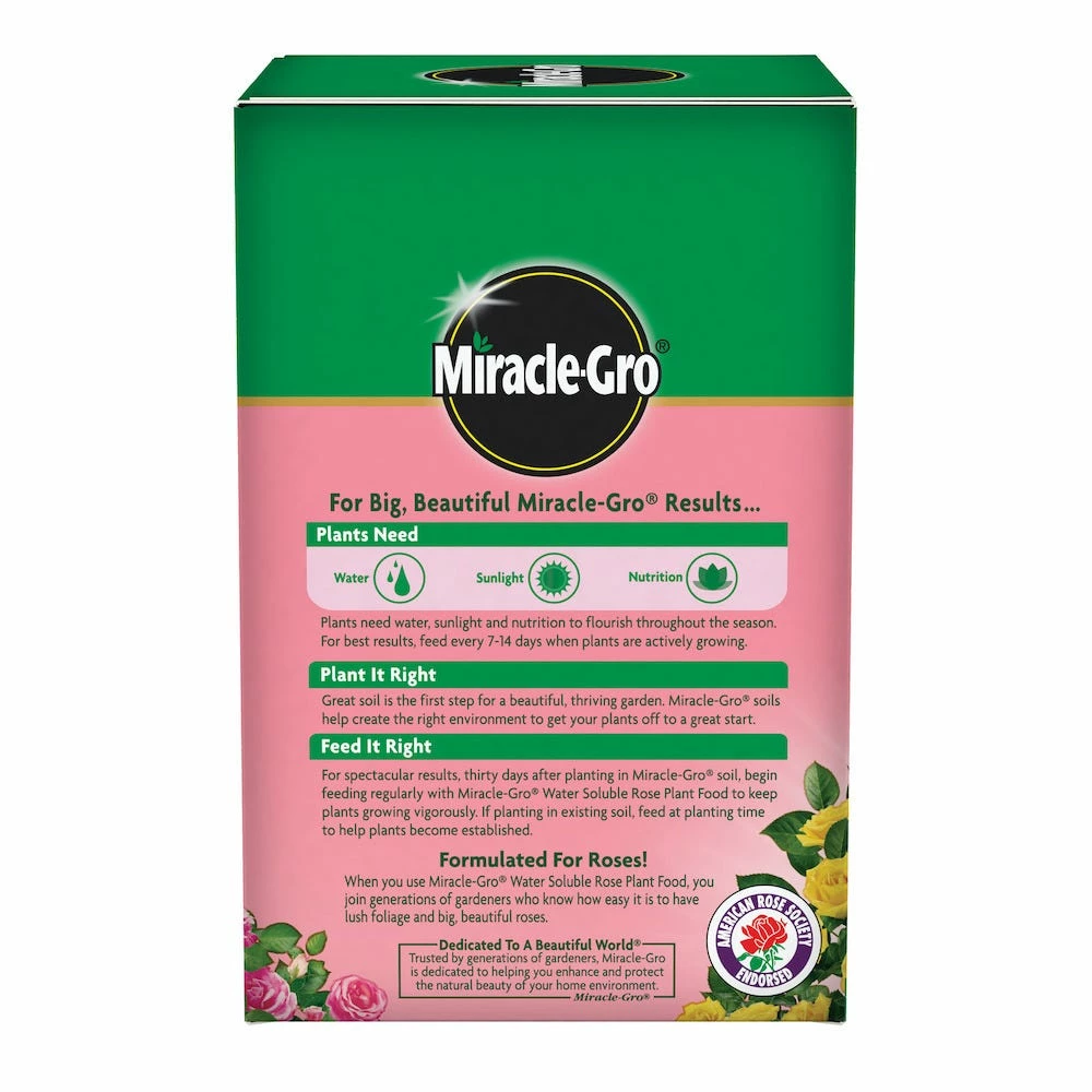 Miracle-Gro Water Soluble Rose Plant Food feeds instantly to grow bigger, more beautiful roses compared to unfed plants. Use with the Miracle-Gro Garden Feeder or any watering can, and feed every 1-2 weeks. Endorsed by the American Rose Society, Miracle-Gro Water Soluble Rose Plant Food will help you get beautiful results.